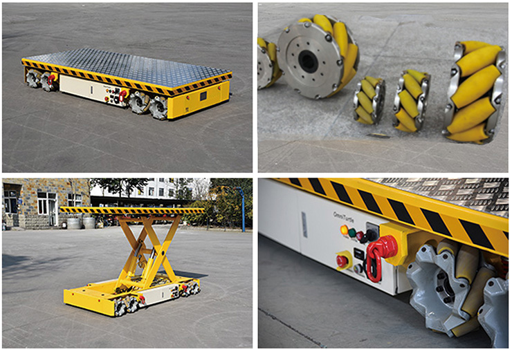 金阳智能全向车系列可以提供1-100T的承载能力 并可实现在平面内向任意方向的平移、自转、平移加 自转运动。常应用于风电设备制造、列车总装、飞机 总装等领域。由于它具有的全向移动性能,操作员可 以操作平台托举重物实现精确定位对接、装配,大大 简化了装配工艺,增强了操作性,降低了装配风险, 提高了生产效率。对于一些不适宜用行车起吊搬运的零部件,或在室内起吊困难的部件,以及需要 厂内长距搬运的重型部件,金阳智能全向车都能给出很好的解决方案。
